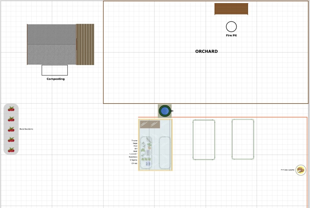 This is my plan for 2025. It shows everything I have done to date. My dad and I built the shed 9 years ago. There is a composting ring next to the shed right now, but that will probably change as the summer rolls around. I bought the greenhouse last summer and moved it to its new, permanent location a few weeks ago. There are two 2′ x 6′ raised beds in the greenhouse. One is a herb garden and the other has tomatoes, carrots, and garlic. I have a garden bench in the greenhouse as well. I need a set of shelves so that I can store more in the greenhouse. The black raspberries were donated by birds a few years ago. The two 4′ x 8′ beds to the right of the greenhouse are in place and waiting on soil. The potatoes have been planted and will be prolific this season. Once the season is over, I will duplicate this plan and the software will suggest new locations for all the plants so that I can do crop rotation and not deplete the soil by planting the same plants in the same location year after year. As I add to the garden and backyard, I will update the plan and those updates will also carry over from year to year. What I am calling the orchard is a work in progress. I haven’t planted any fruit trees yet, but that will change this weekend. I might even give the fire pit its first use over the weekend!