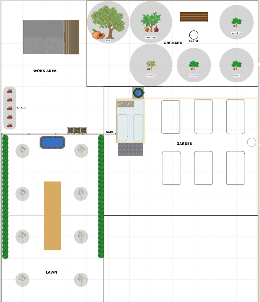 This is my master plan. It is only 70′ of the 96′ depth for the back yard.I am trying to create “zones” that all serve a different purpose. I envision the area labeled “lawn” to be reminiscent of an Italian lawn, flanked on both sides by tress with a long table centered in the space for entertaining. There will be some sort of water feature at the far and of the lawn with a shrub fence to isolate the area and give it a feeling of calm. There is the garden area of course. A few more 4′ x 8′ raised beds, rain water collection (which is already in place.), a woven twig fence at the back of the garden to make a separation between it and the orchard. A gate on the left of the greenhouse to separate the work area from the garden completes the garden. There is a huge sycamore tree currently in the work area, which isn’t shown. I am trying to figure out if it needs to be removed for safety, or if it can remain in place. I am hoping to expand on the black raspberries with the addition of some red and golden raspberry plants. There is a fence in the drawing that separates the work area from thew lawn and might be a good place for another garden building. I have a brick structure with ivy, moss, and a corrugated metal pictured in my head. You can never have too much outdoor storage. All of this leaves a space of 20′ x 35′, and a space of 23′ x 60′ to plan out.