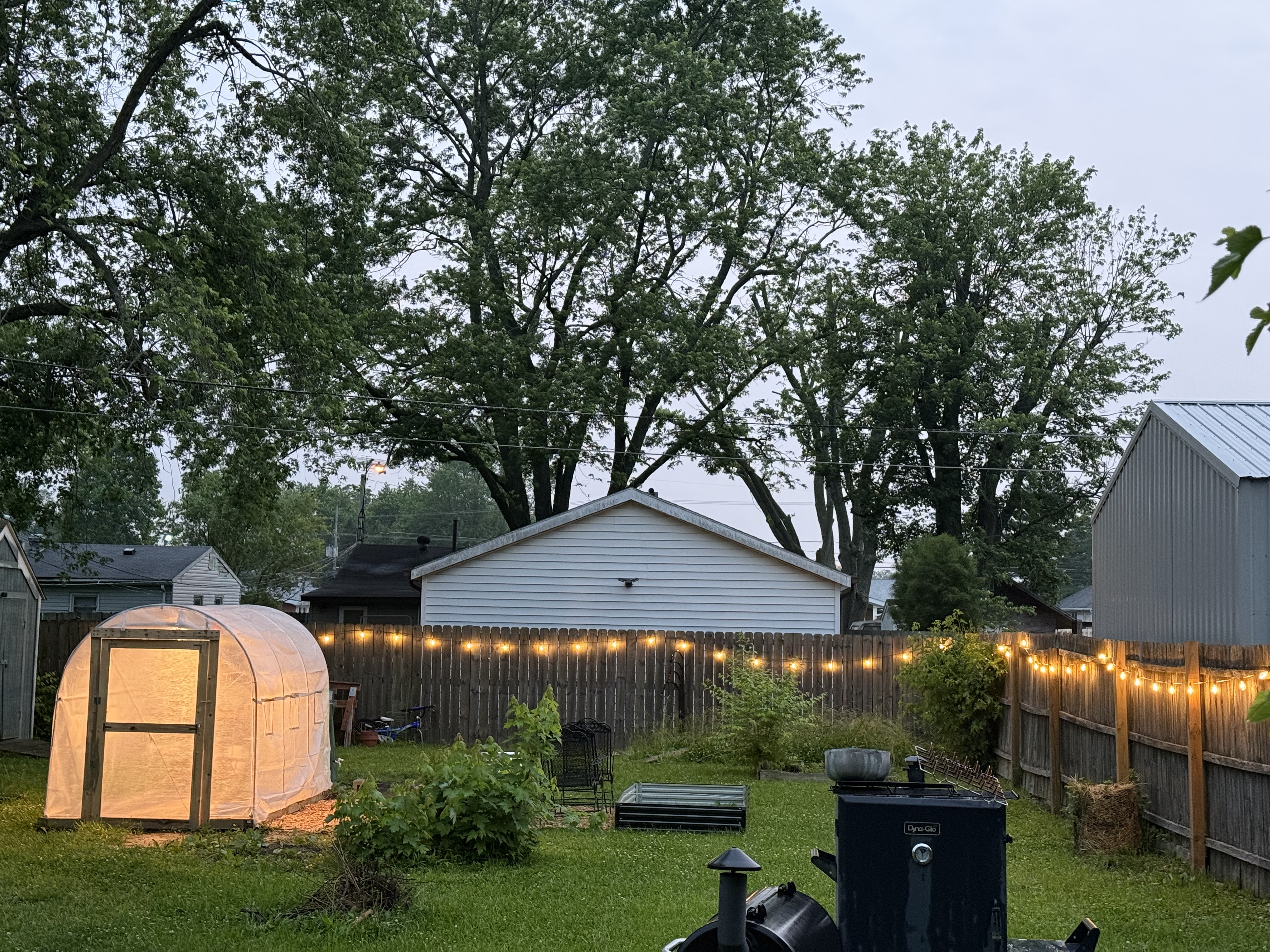 I had a vision of a greenhouse bursting at the seams with produce, six raised beds all planted with a variety of vegetables and flowers. All lined with neat wood chip paths between. I planned a couple of fruit trees in the orchard. I made plans for a water feature, composting set up, seating areas and a nice fire pit. In hindsight, that was probably a bit ambitious. I was only able to get the greenhouse set up, two “almost” ready raised beds, the start of a fire pit with seating, and a couple of wood chip paths.